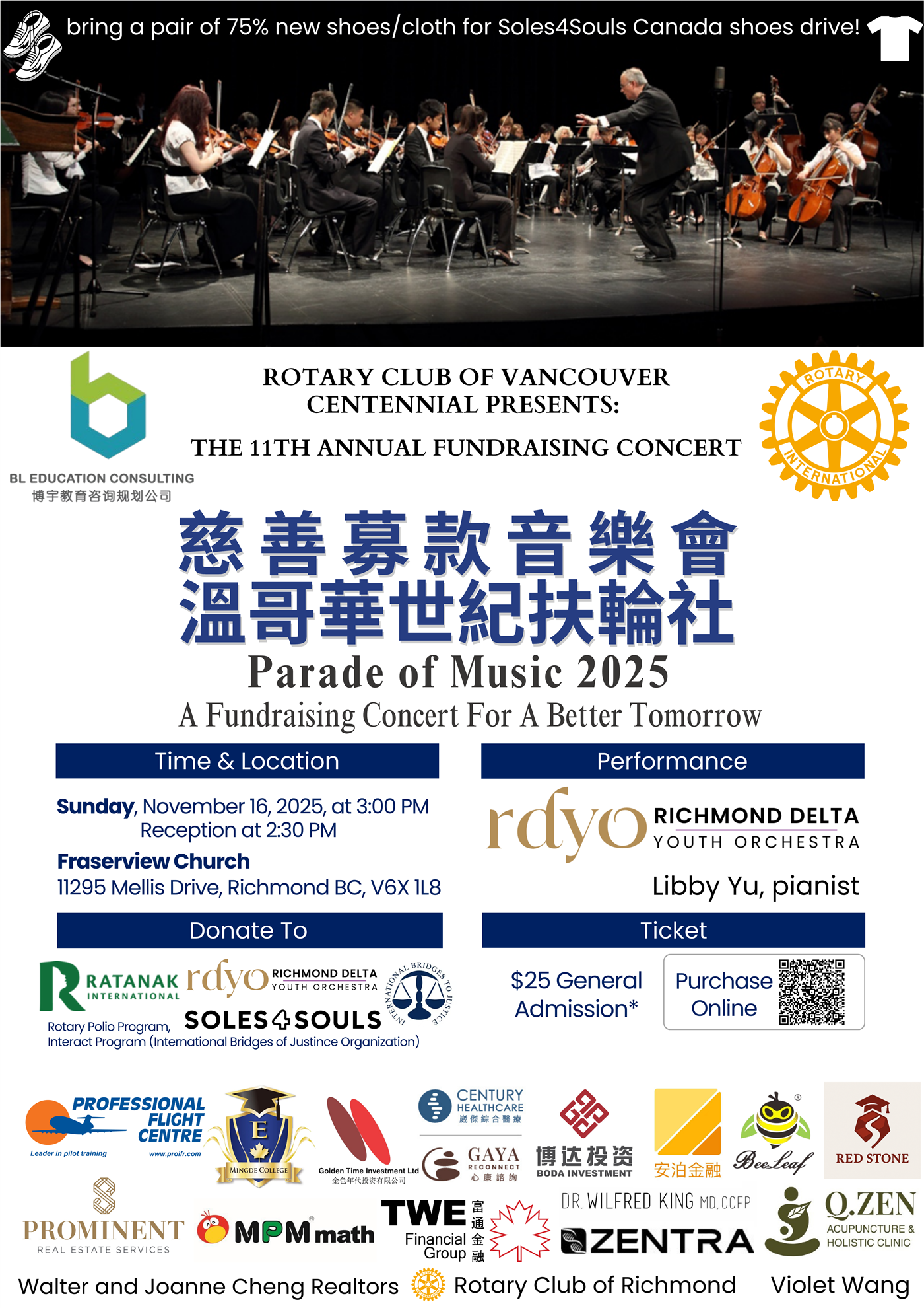 The Rotary Club of Vancouver Centennial and our title sponsor BL Education Consulting invite you to Parade of Music 2025